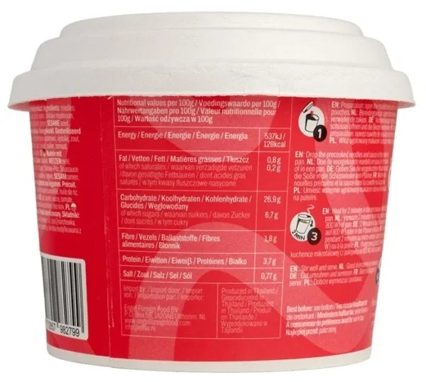 Noedels: Tarwebloem, Water, Tarwegluten, Gemodificeerd tapiocazetmeel, Rijstolie, Zout